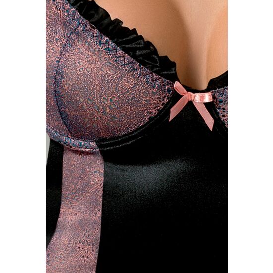Raso negro suave combinado con encaje en tonos coral y turquesa en dos franjas verticales y copas del sujetador ✨.