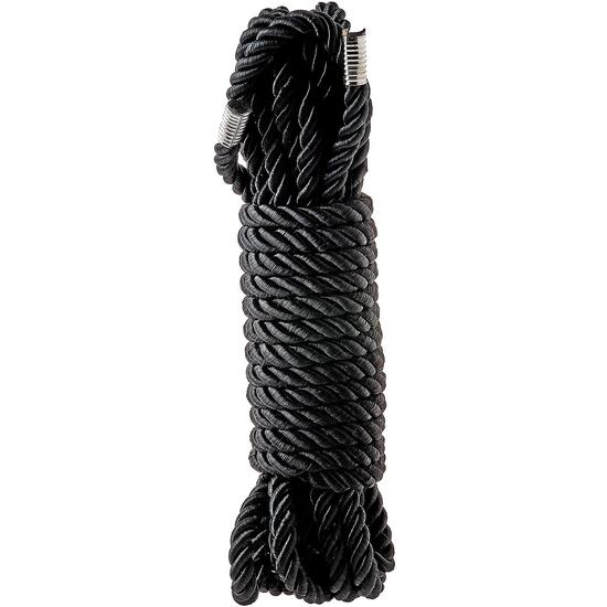 Cuerda negra de 5 metros, sedosa y suave, con extremos metálicos anti-deshilachados. Perfecta para principiantes y expertos en Shibari o Kinbaku. Explora nuevas sensaciones con tu pareja LGTBI 💋✨.