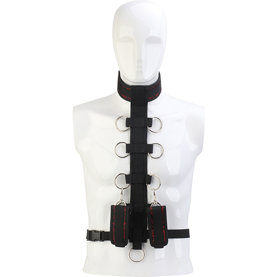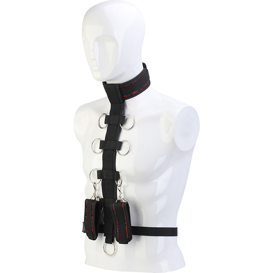 ¡Lleva tus juegos BDSM al siguiente nivel! 😈💦 Este arnés de restricción corporal incluye cuello y puños desmontables con decoración bordada roja 🌹💥, ajustables con Velcro para un confort perfecto. La banda de cintura con cierre de hebilla y los ganchos de mosquetón permiten conectar los puños a cualquiera de los 9 anillos O, y añadir otros accesorios BDSM como cadenas o pesos extras 🔗✨.