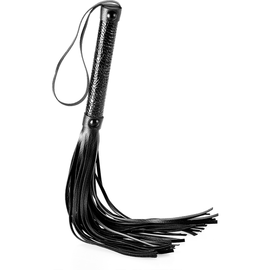 Látigo negro con tiras de 24 cm, mango resistente y correa de muñeca. Perfecto para alternar caricias y latigazos con estilo y sensualidad 💋🔥.