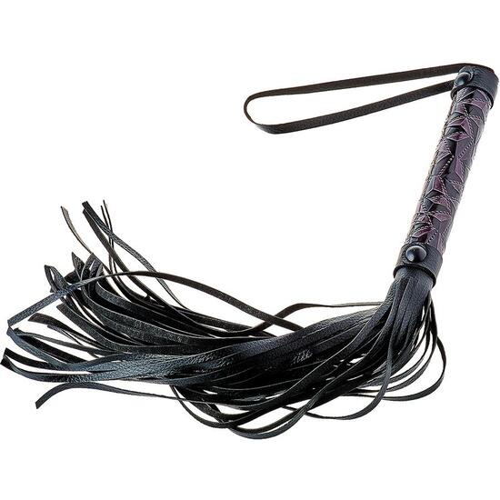 Flogger elegante en negro y púrpura con cuerdas de aspecto cuero y mango resistente, ideal para juegos BDSM excitantes y sofisticados 😈💋.