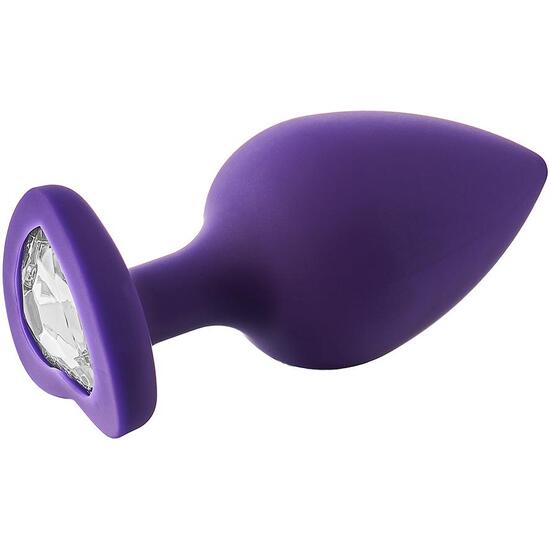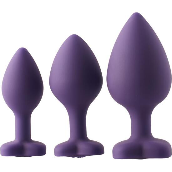 🔥 Kit de 3 plugs anales de silicona en púrpura con piedras de corazón 💎. Perfecto para entrenar progresivamente y disfrutar de placer anal cómodo y excitante 😏💦.