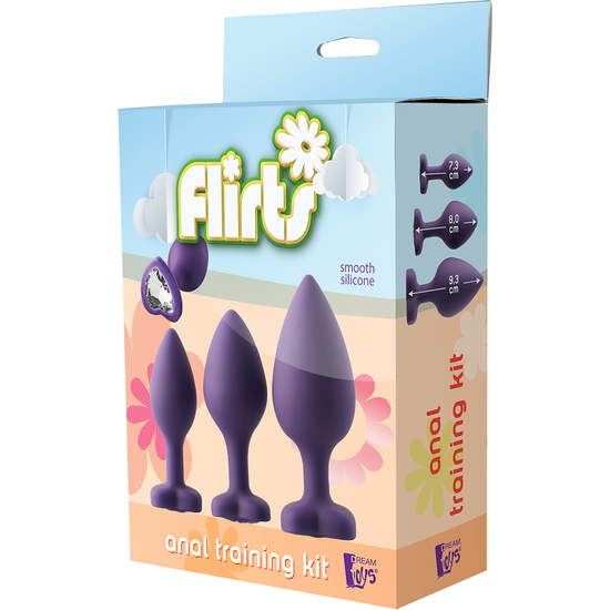 🌸 ¡Prepárate para un viaje de placer anal lleno de color y diversión! El Flirts Anal Training Kit viene en un púrpura brillante, con tres conectores de silicona de diferentes tamaños para que entrenes desde lo pequeño hasta lo grande 🔥. Cada plug tiene una piedra de corazón en la base que añade un toque sexy y elegante a tus juegos 💖.