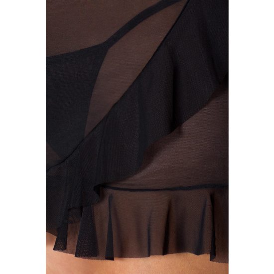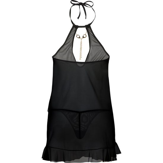 Vestido sexy negro semitransparente 🔥 con volante y tanga a juego 👙. Anudado al cuello con collar incluido ✨.