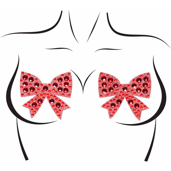 Cubrepezones en forma de lazo rojo con strass, sexys y brillantes, ideales para sorprender en la intimidad.