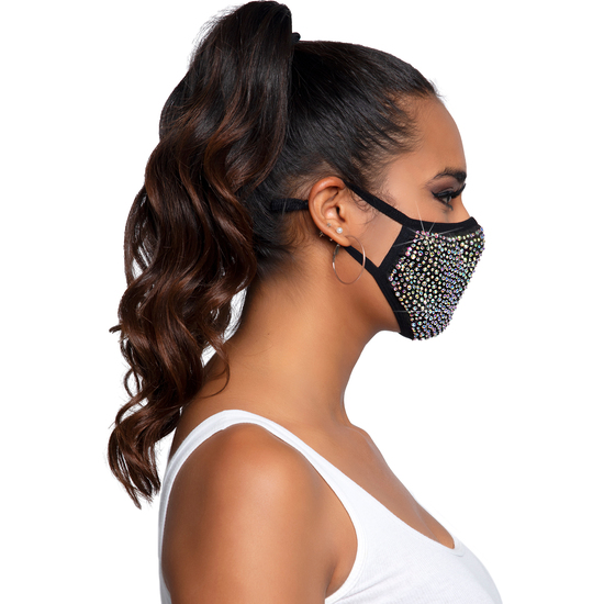 Leg Avenue Zuri Rhinestone Face Mask ✨: máscara facial con strass AB, ajustable y reutilizable 😷💎. ¡Protección con estilo para cualquier ocasión!
