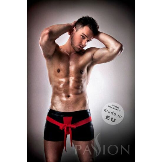 Mini short tipo bóxer 🖤 de látex con lazo rojo 🎀, estilo “Calzoncillo Regalo”, atrevido y provocador 🔥
