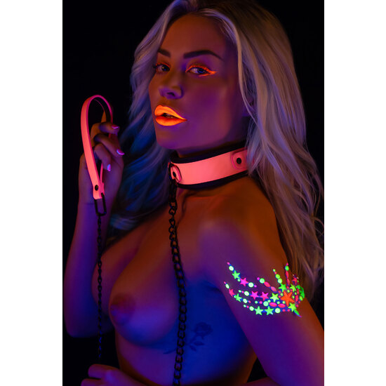 Collar y cadena TABOOM con luz en la oscuridad, de cuero vegano y materiales premium. Ideal para parejas LGTBI que quieren un toque kinky y fashion en sus juegos BDSM 😏💋.